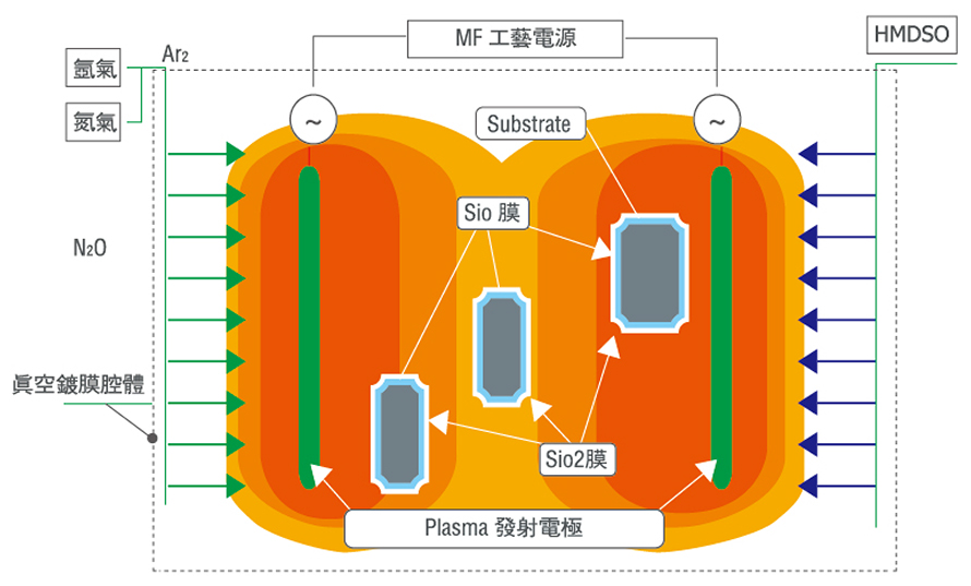 在幾百伏的高電壓下反應(yīng)成矽膠(Si02),并附著在前工序鍍好的金屬膜上起到防止氧化的作用。