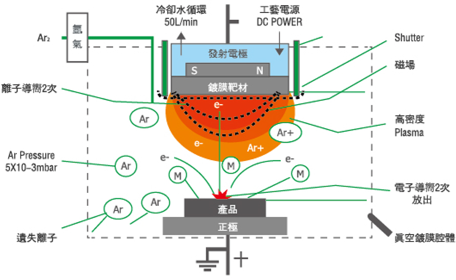 在適當(dāng)?shù)恼婵窄h(huán)境下充入一定量的氣體(如氬氣)加上60千瓦的直流電源時會產(chǎn)生幾百伏的高電壓產(chǎn)生電弧,在電弧環(huán)境下離子和電子并同靶材沖突產(chǎn)生鍍膜效果。